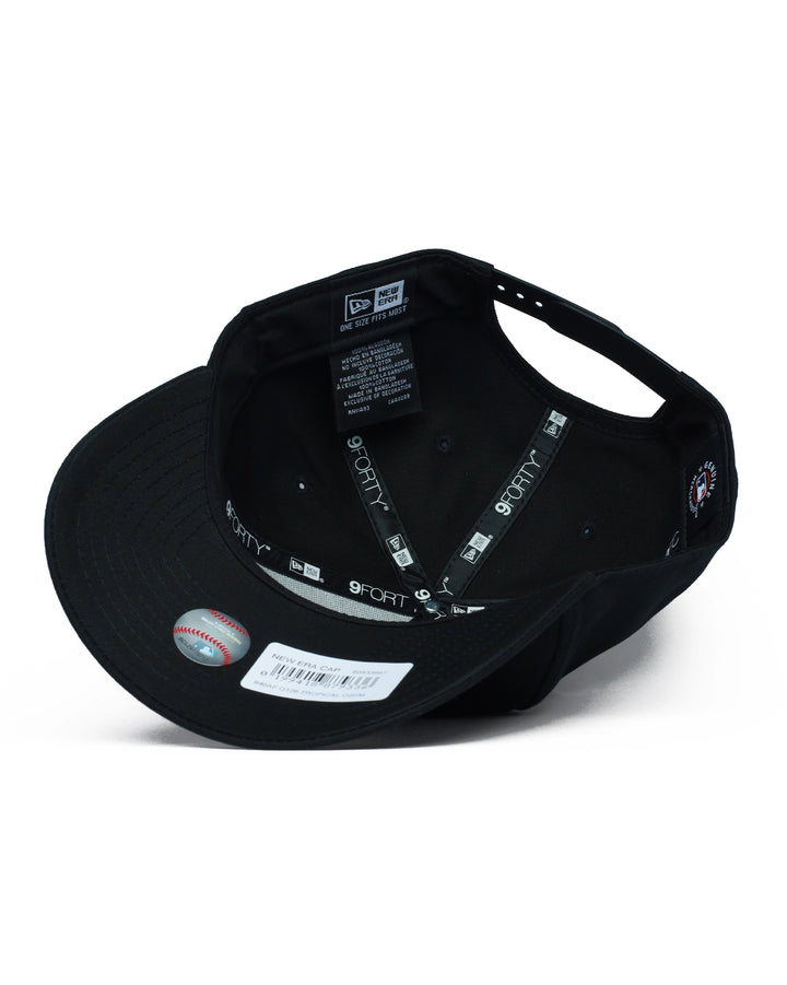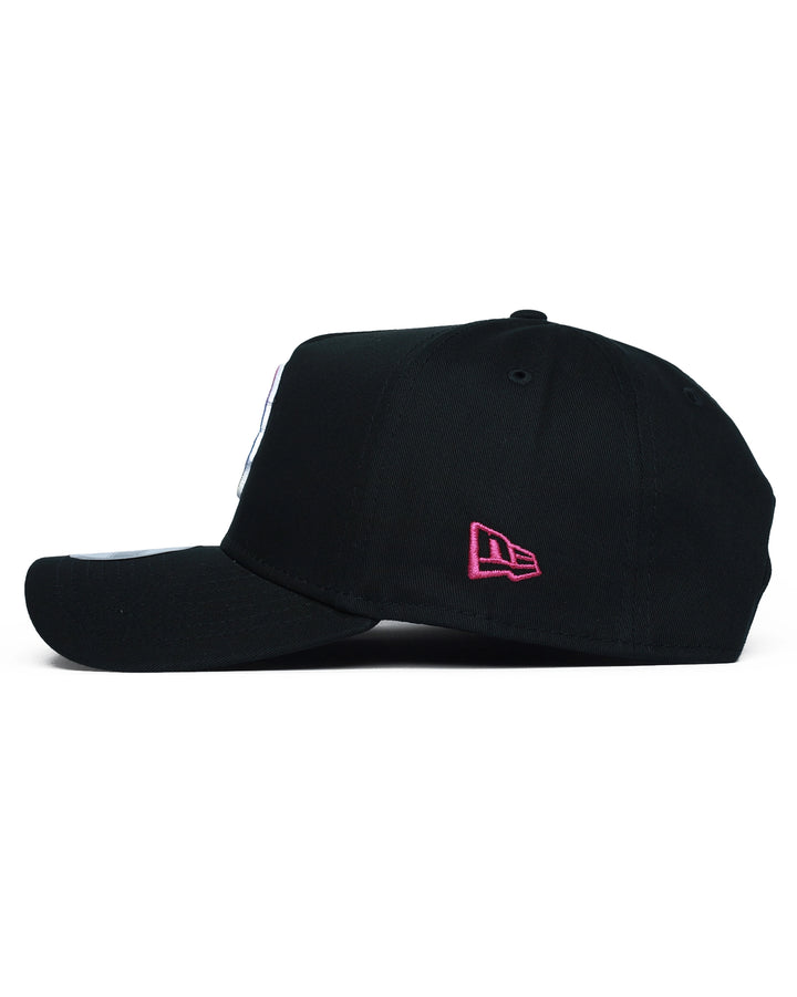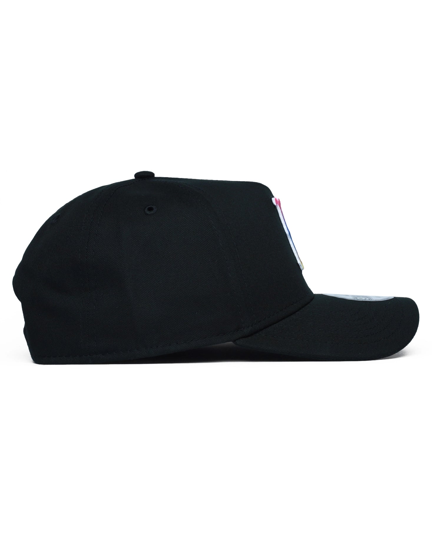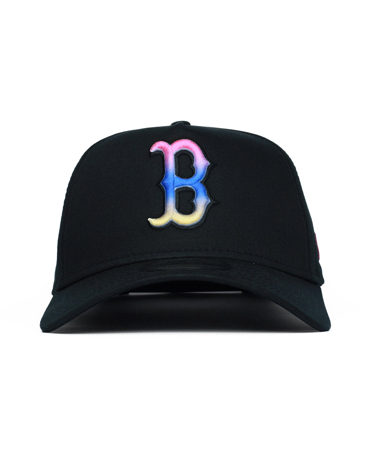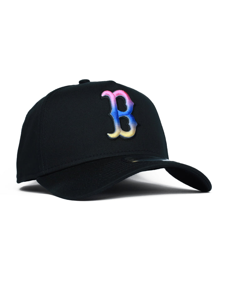 Add a bold splash of color to your headwear rotation with this Boston Red Sox Tropical Blend 9FORTY A-Frame cap. Combining a sleek black base with vibrant, sunset-inspired gradient embroidery, this hat offers a striking modern take on classic MLB style. The iconic "B" logo features thick, raised 3D embroidery with a stunning vertical color gradient—hot pink at the top, vivid blue in the middle, and bright yellow at the base. The classic 5-panel A-Frame construction delivers a high-profile, structured crown with a pre-curved visor for an immediate, street-ready fit. Cohesive accents include the New Era flag logo on the side, flat-stitched in bright pink to complement the gradient. A black plastic snapback closure ensures secure, adjustable fit for most head sizes. Made with 100% cotton for comfort and durability.