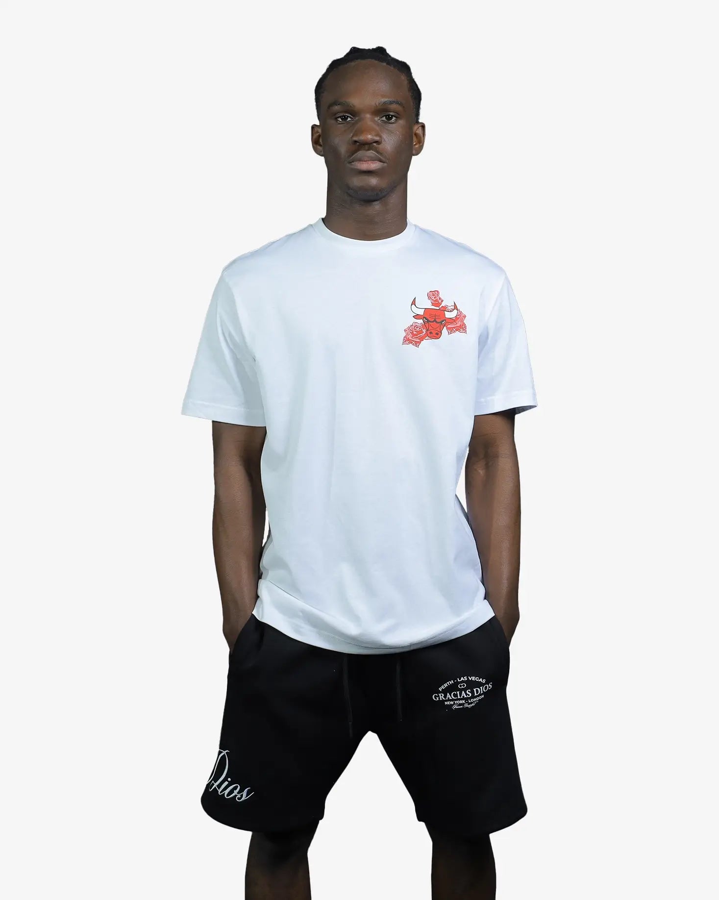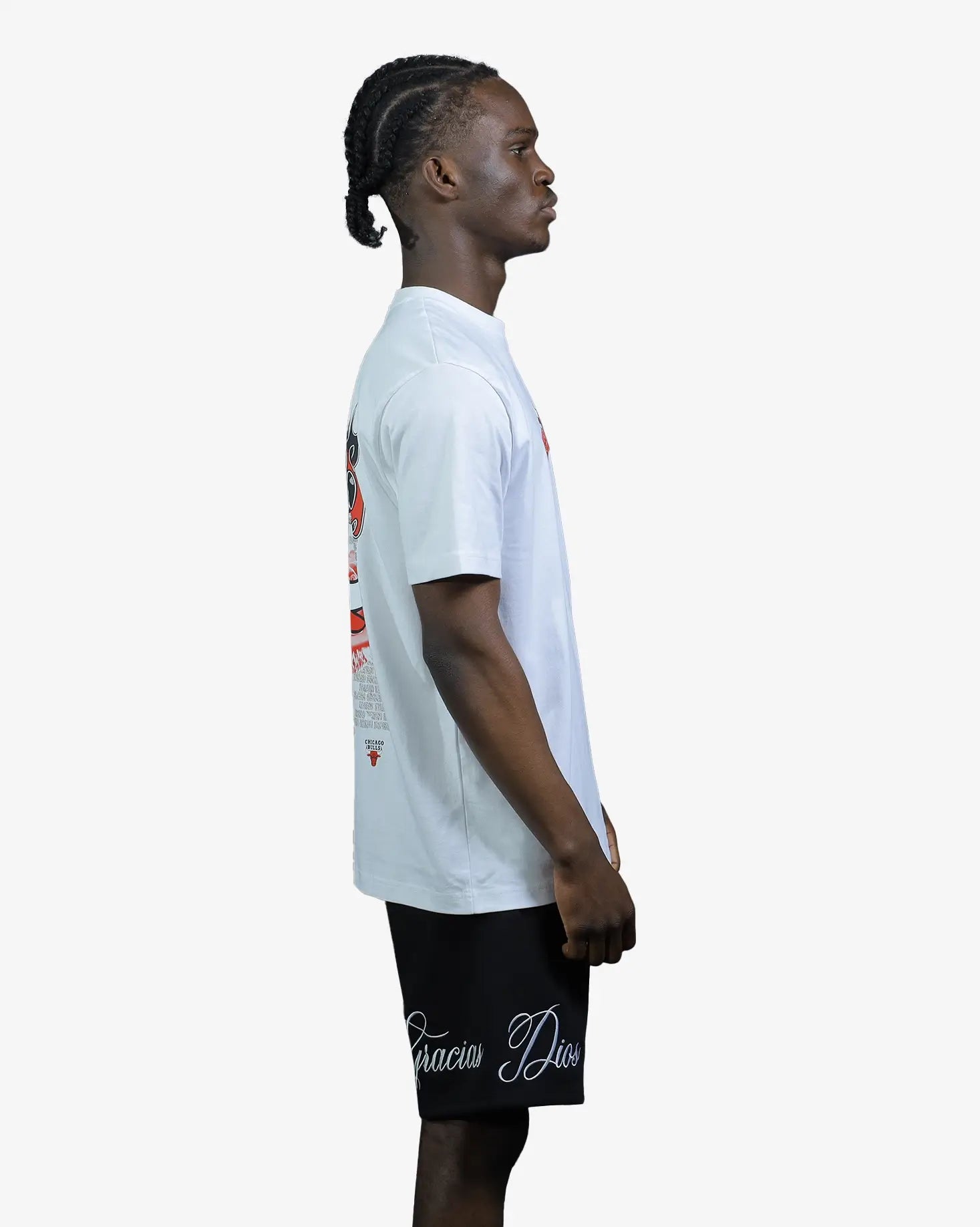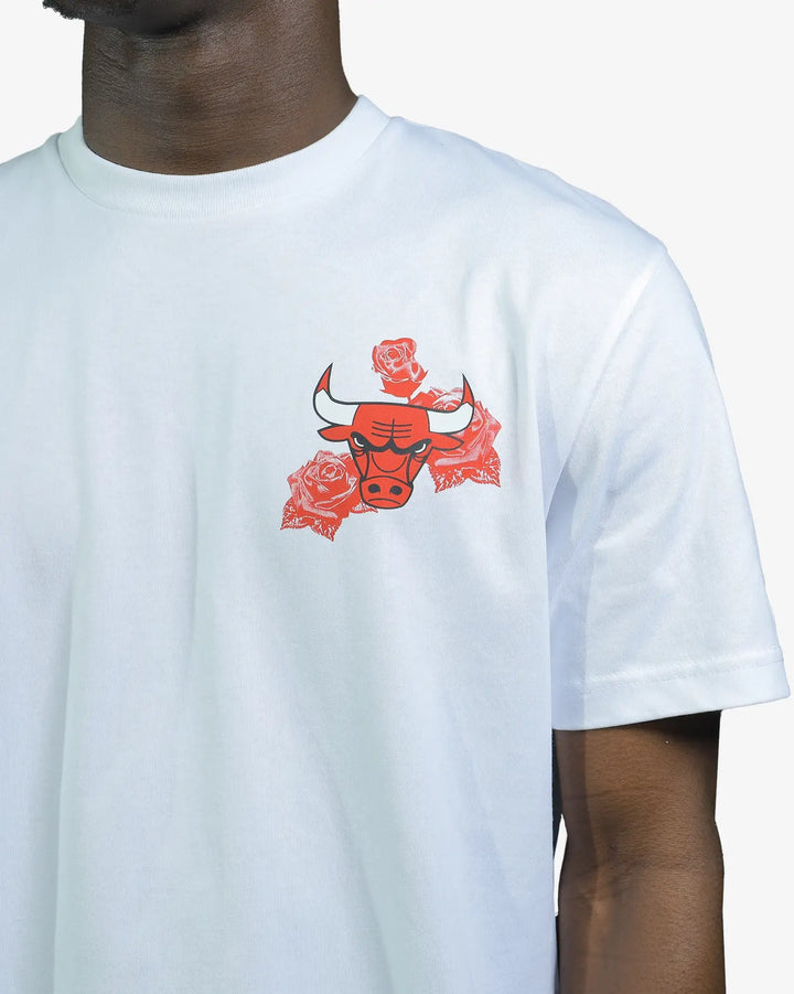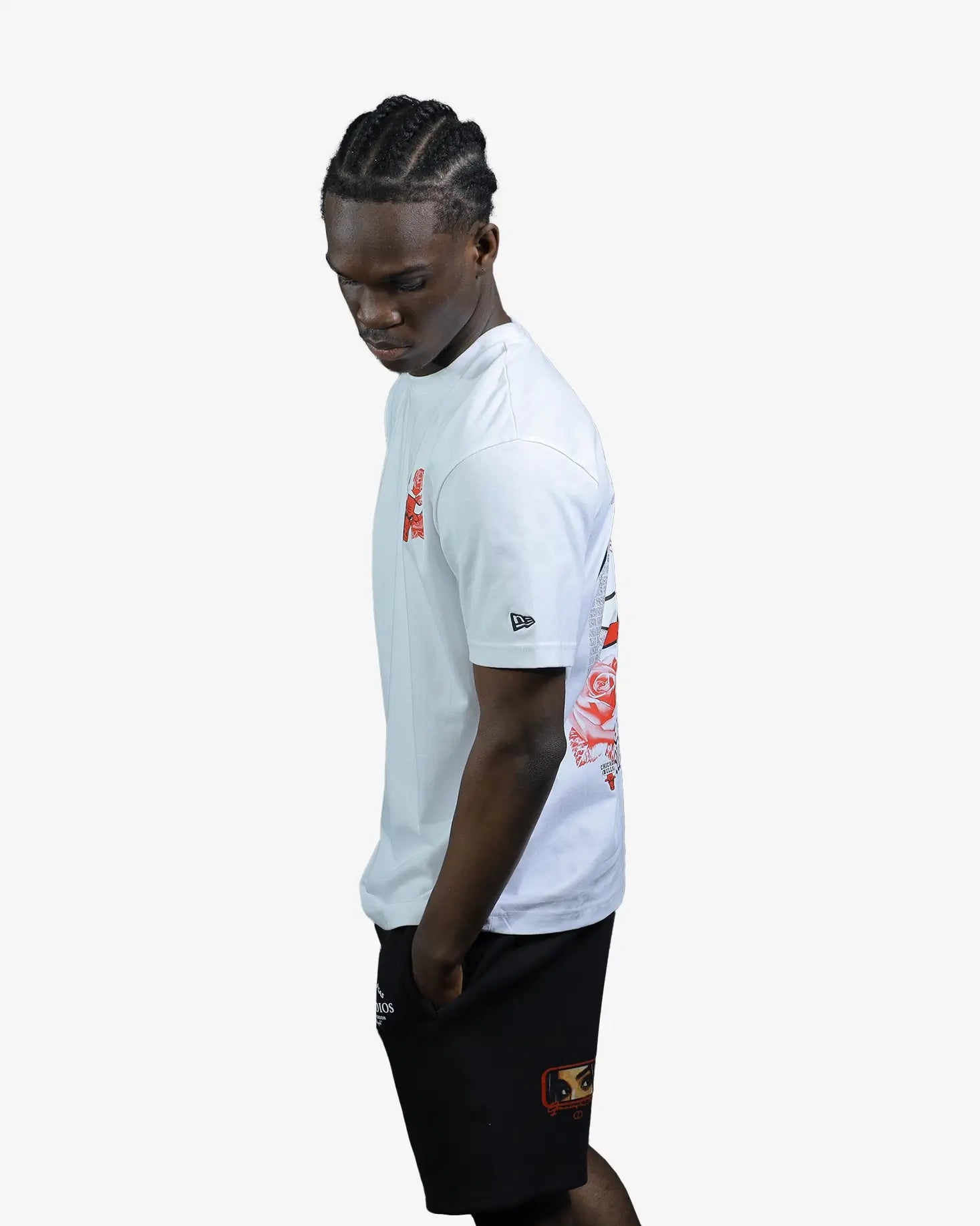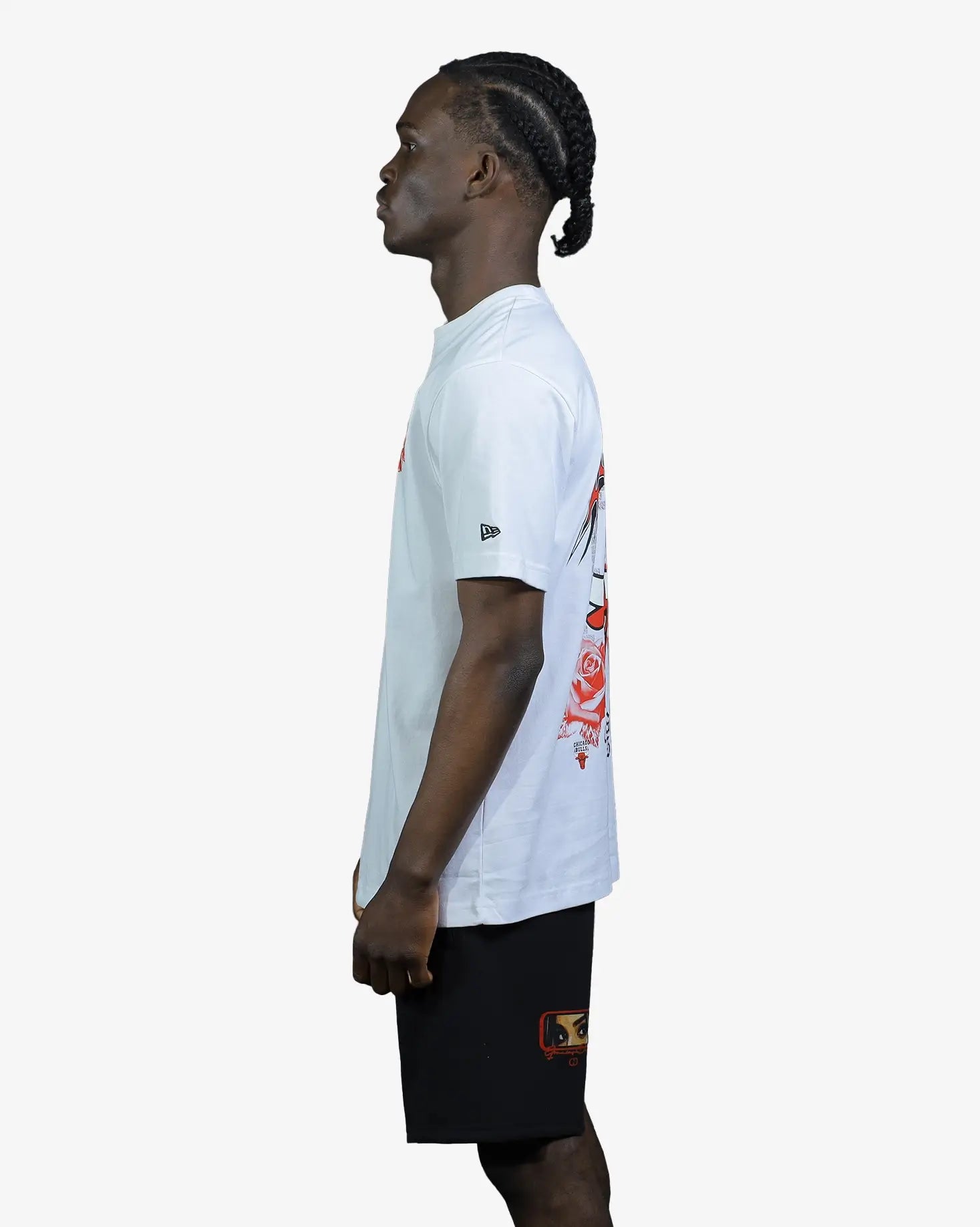 Celebrate your Bulls pride with this officially licensed New Era tee, featuring bold printed team graphics that command attention. The oversized silhouette, dropped shoulders, and ribbed crewneck deliver effortless streetwear style, while twin-needle stitching ensures durability through countless wears. Crafted for game day and beyond, this white tee combines authentic NBA merchandise quality with contemporary fashion sensibility. Perfect for fans who demand both heritage and edge in their collection.