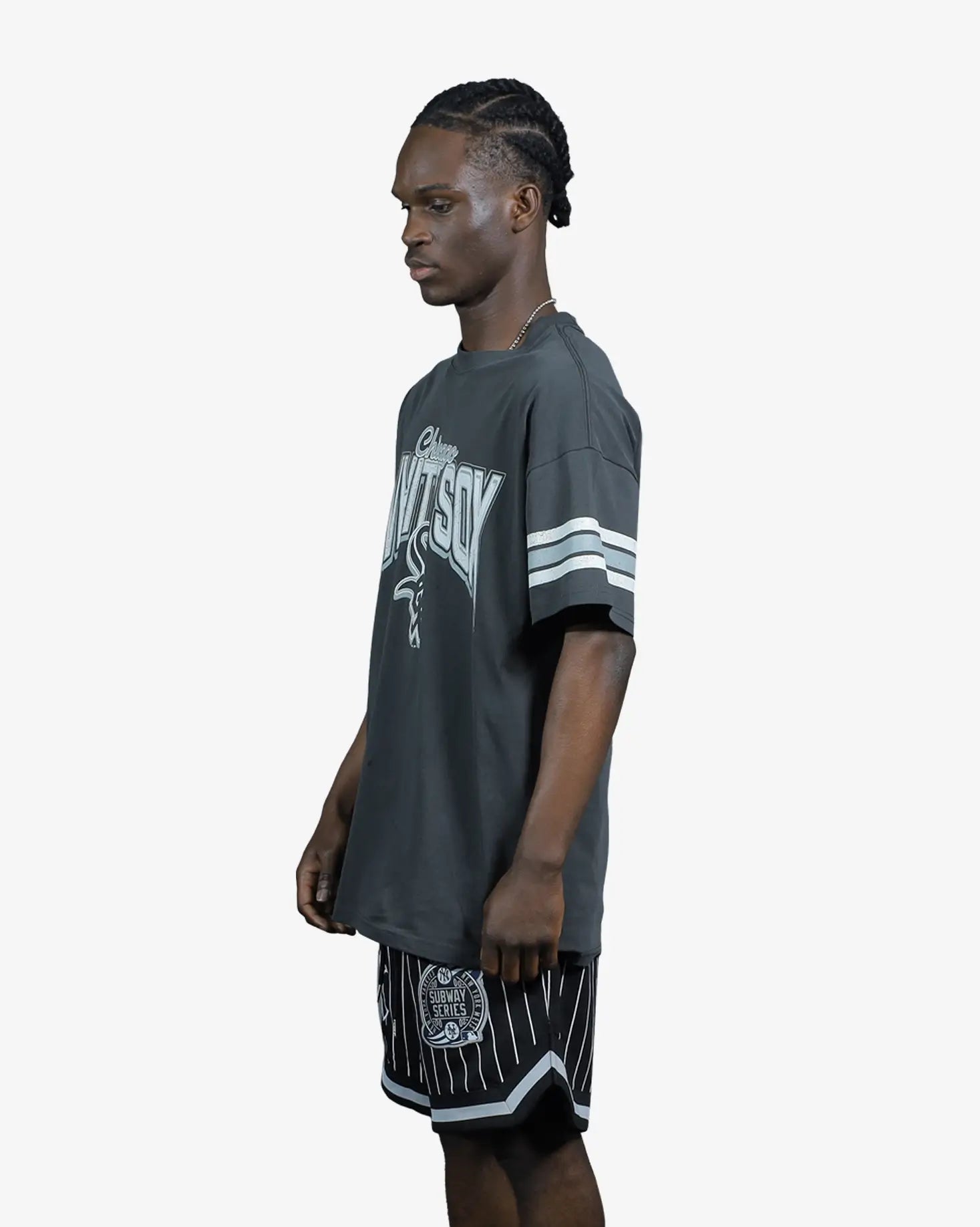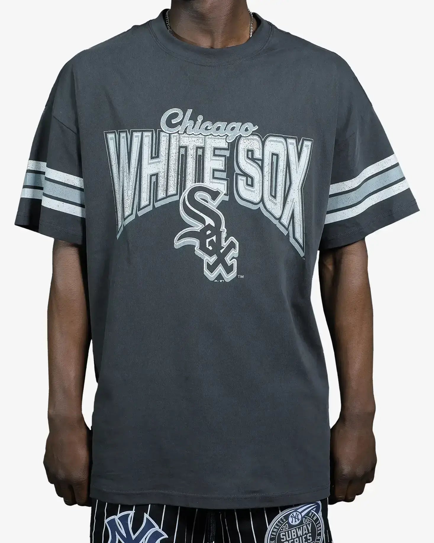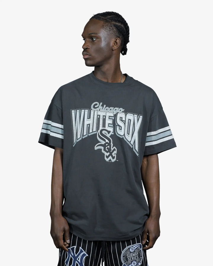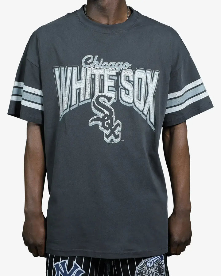 Elevate your streetwear collection with the Chicago White Sox Faded Vintage Strip Arch T-Shirt. This oversized tee fe...