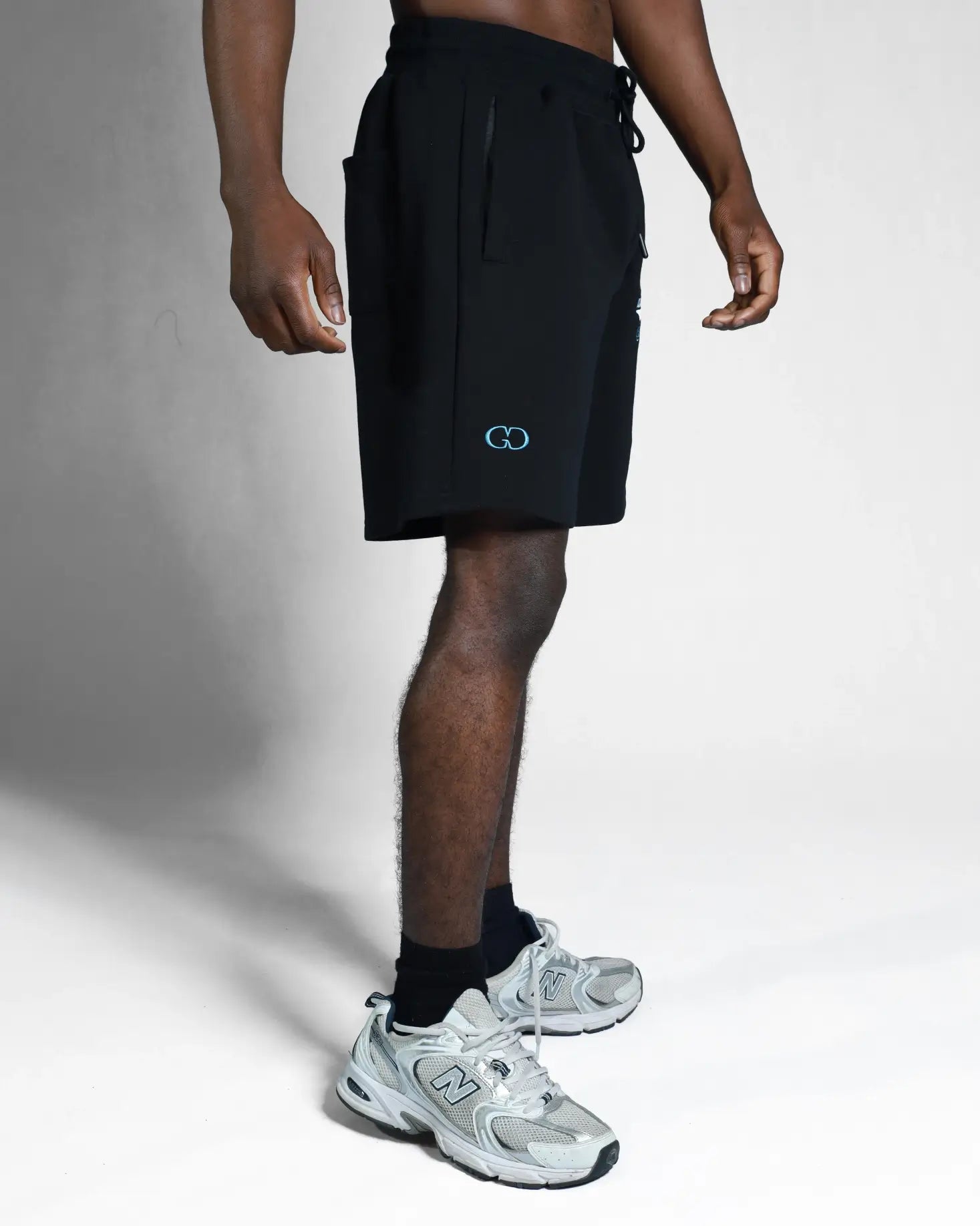 Details: Subtle "GD" logo embroidery in sky blue tone on the right side leg.
