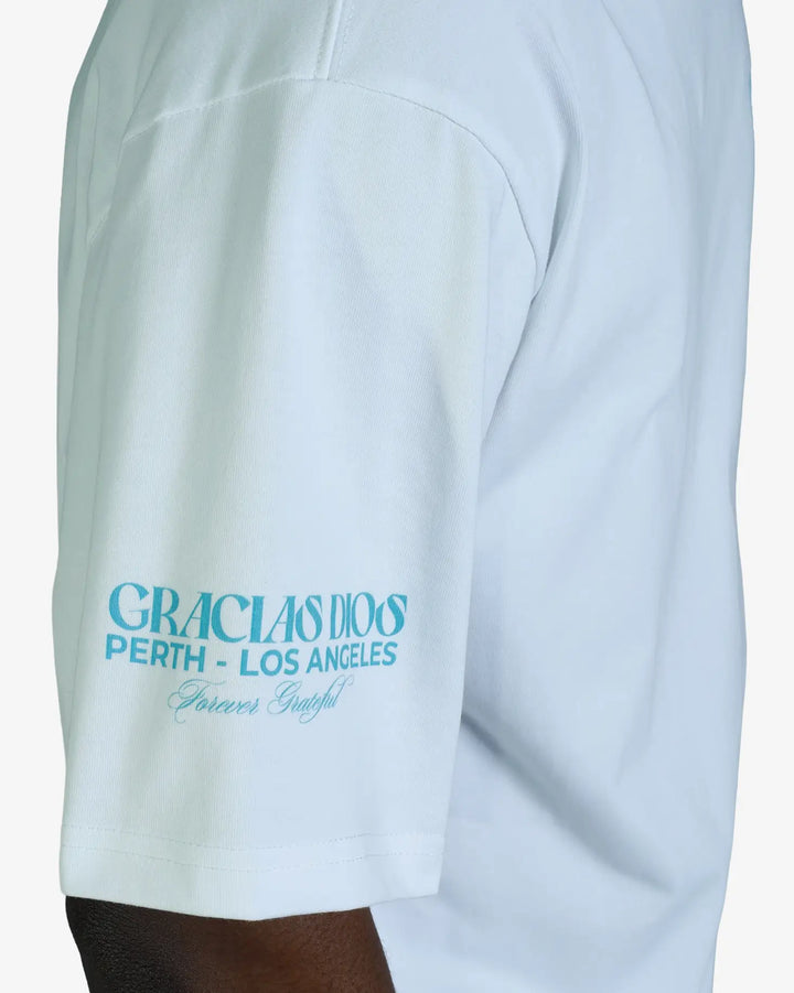 Details: Subtle embroidered "GD" logo on the left sleeve and bold "GRACIAS DIOS PERTH - LOS ANGELES, Forever Grateful" text on the right sleeve.