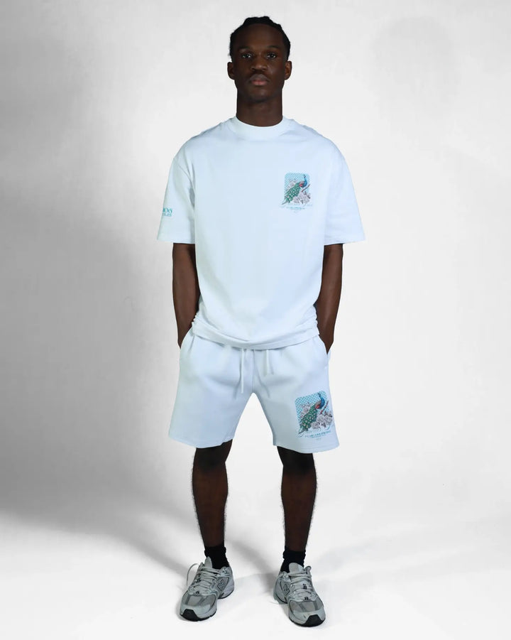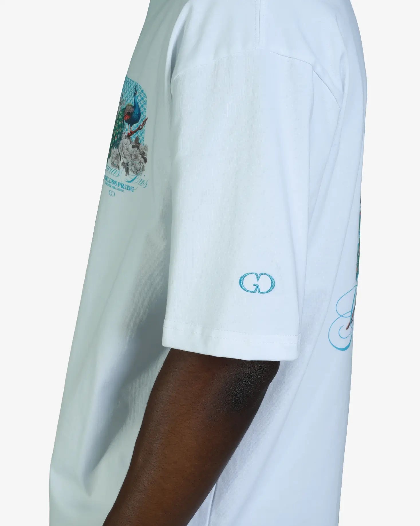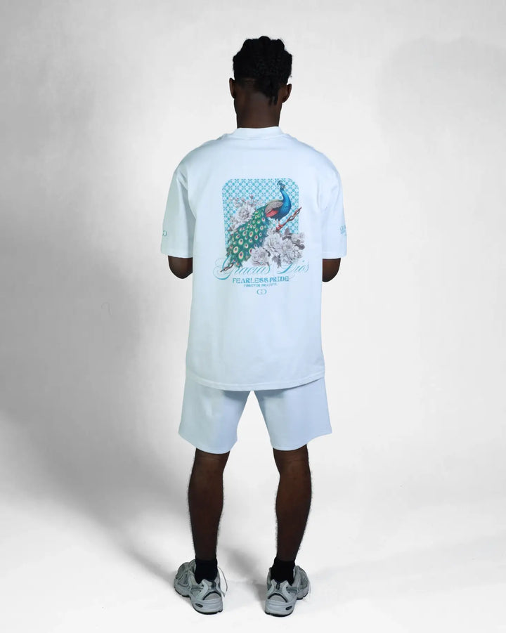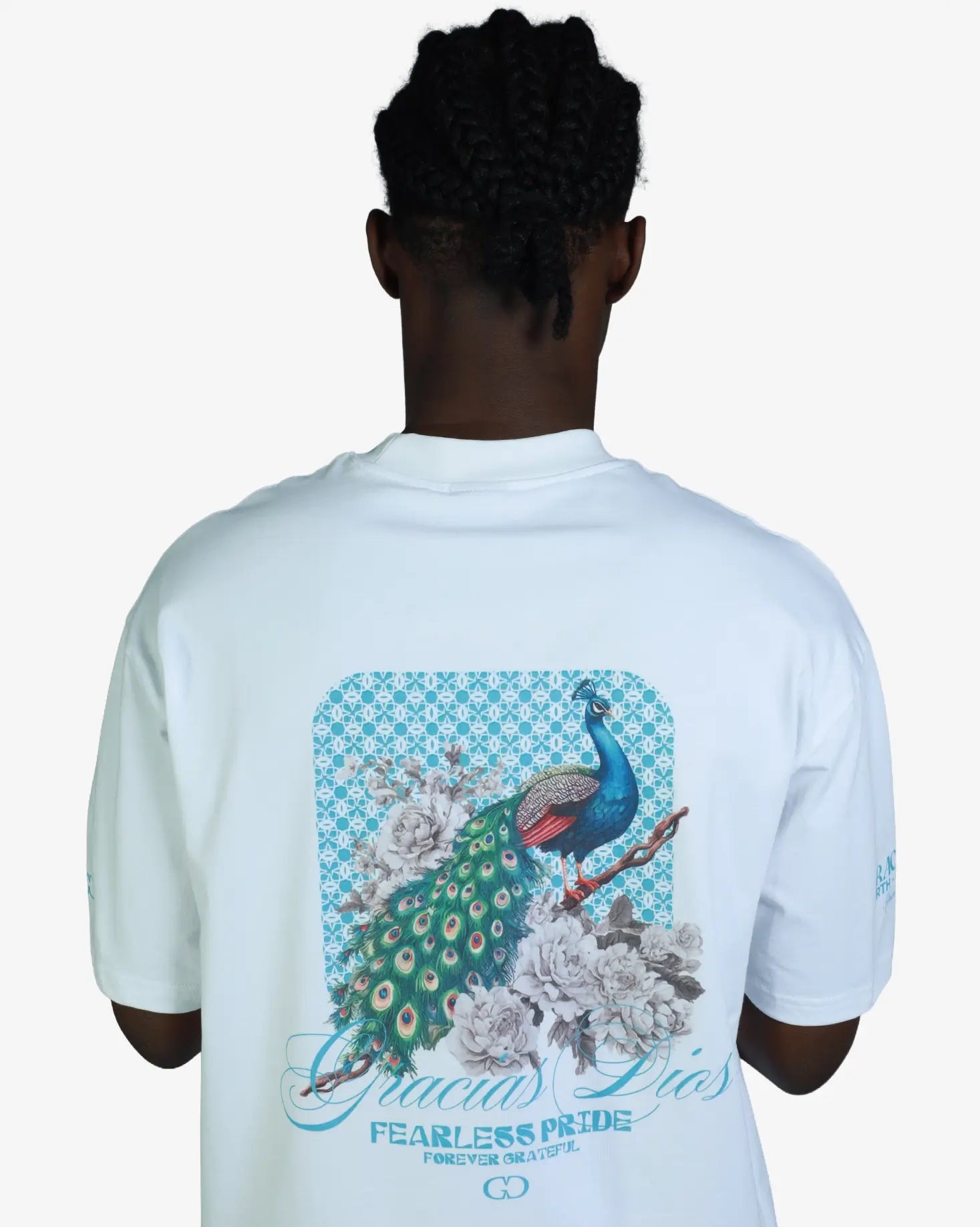 The GD Fearless Pride Oversized T-Shirt delivers contemporary streetwear with purposeful design. Cut for a relaxed, modern fit, this white tee prioritizes comfort without compromising on visual impact. The standout back graphic showcases a striking peacock illustration nestled within botanical elements, complemented by geometric detailing and the meaningful "Gracias Dios" script. Perfect for those seeking apparel that balances everyday wearability with expressive, statement-making aesthetics.