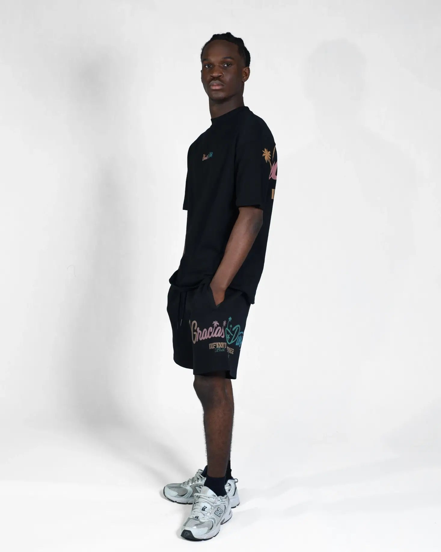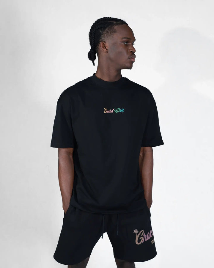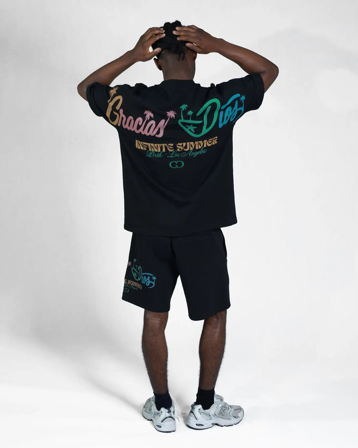 Graphics: Central chest logo and large back and on sleeves DTG print featuring "Gracias Dios Infinite Summer" typography in retro pastel colors