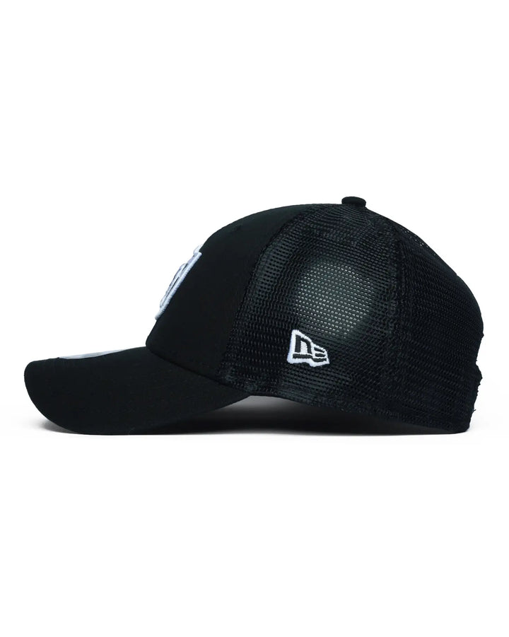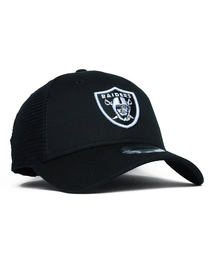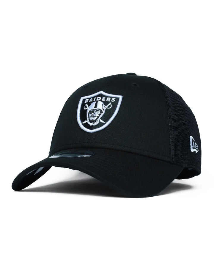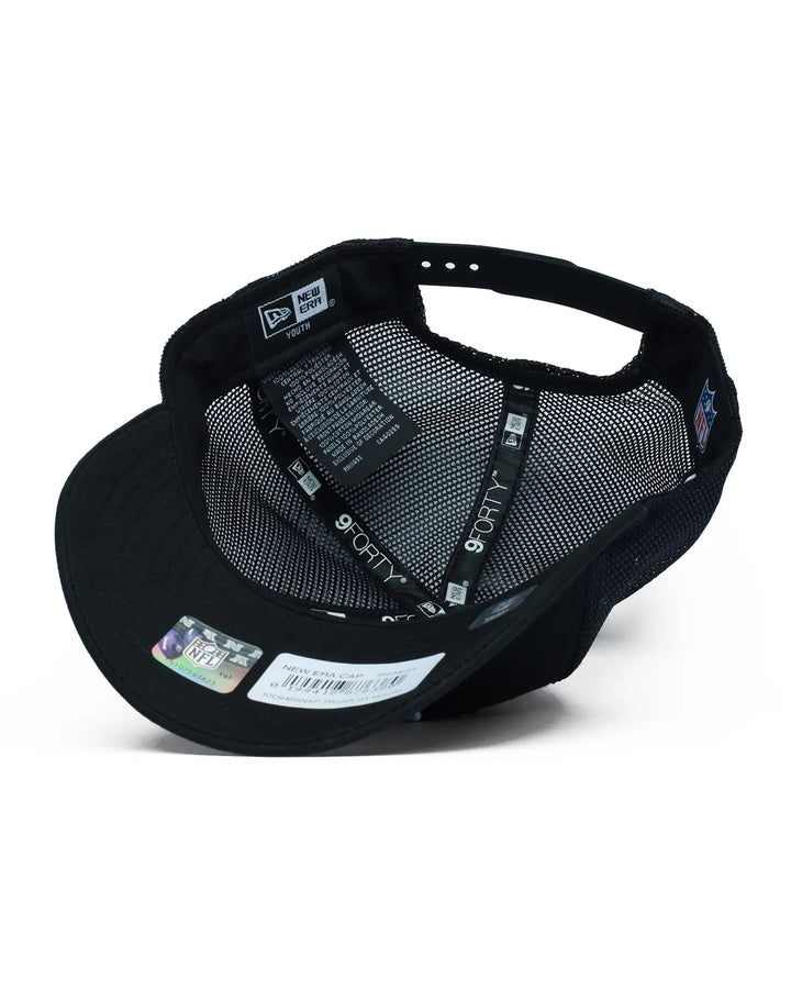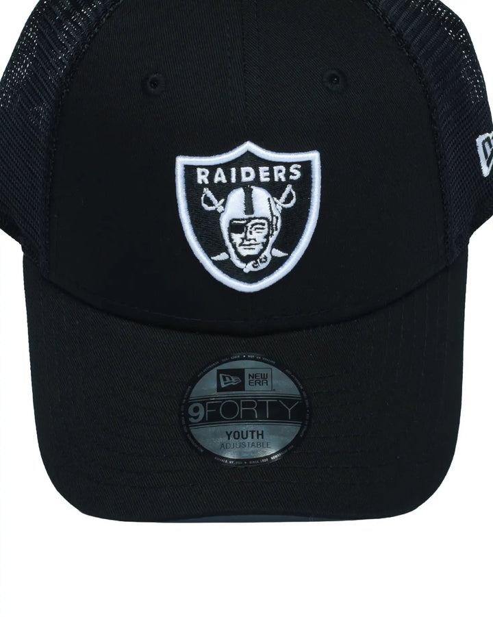 Capture that classic streetwear aesthetic with this Las Vegas Raiders Youth 9FORTY Trucker hat. Built for everyday wear, this piece combines a structured design with breathable comfort, making it a staple headwear option for any young fan's rotation. Classic Silhouette: The New Era 9FORTY profile features a structured front panel and a pre-curved visor, offering a clean, ready-to-wear look right off the shelf that holds its shape over time. Premium Embroidery: The iconic Raiders shield logo is rendered in high-quality, raised white and silver stitching on the front center, contrasting sharply against the solid black crown. The signature New Era flag is flat-embroidered in white on the left wear side.