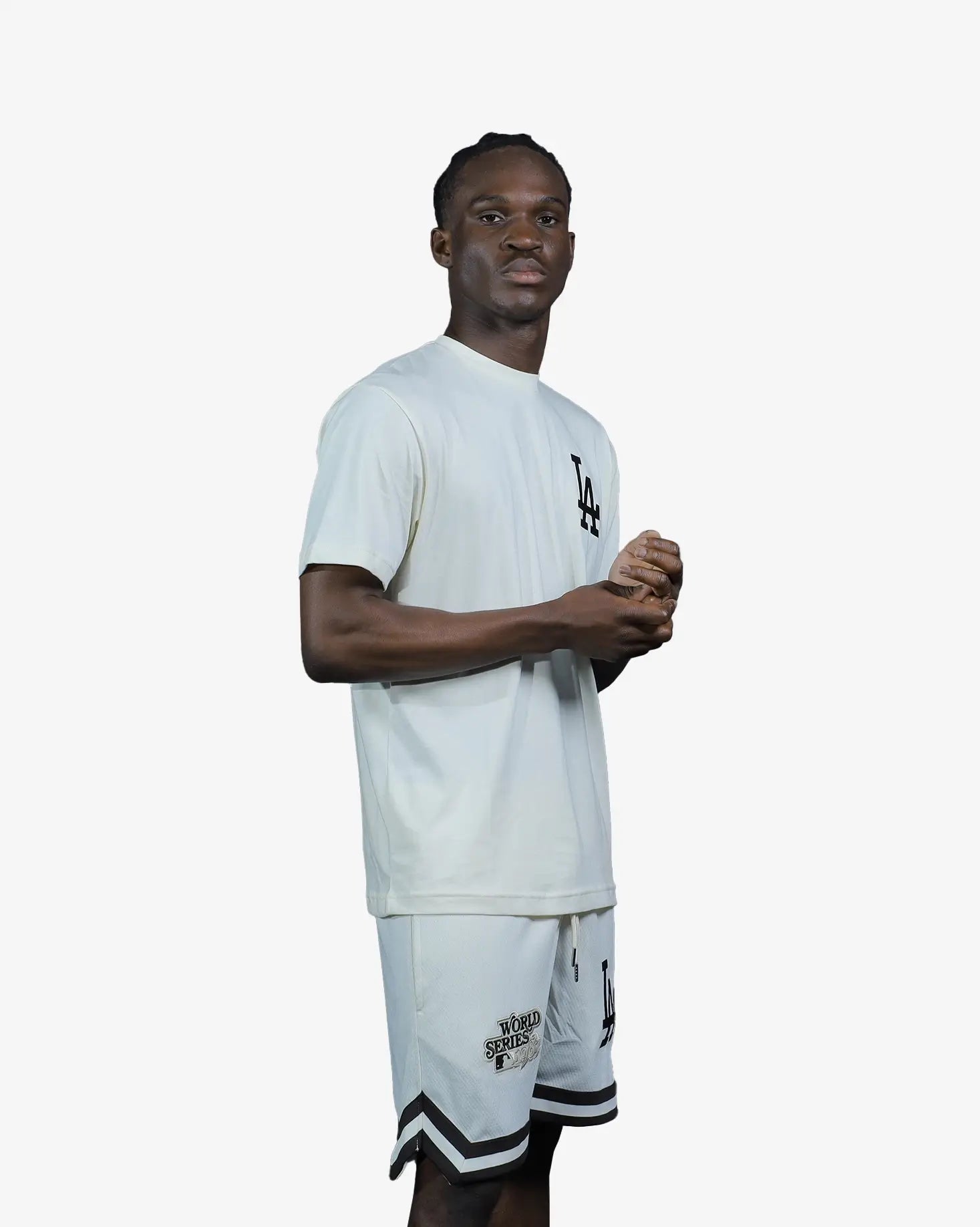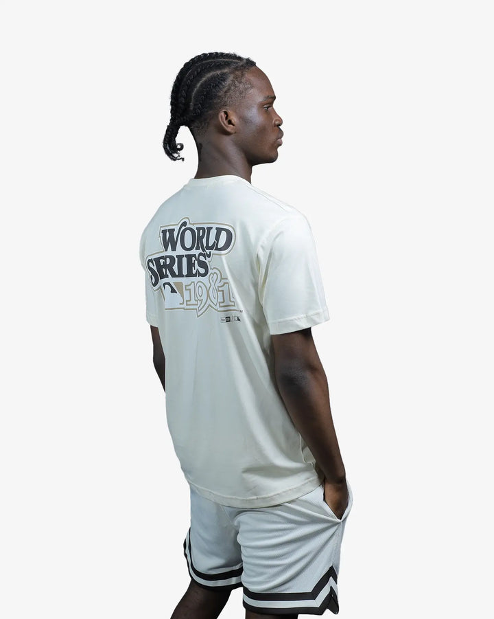 Celebrate iconic baseball history with this Los Angeles Dodgers World Series Champion T-Shirt. Featuring the legendary LA Dodgers logo on the left chest and a striking 1981 World Series graphic dominating the back, this tee captures a defining moment in sports. The NE Flag logo on the sleeve adds distinctive character to the design. Crafted from premium 190 GSM 100% cotton jersey, it delivers comfort and durability with an oversized silhouette that delivers contemporary streetwear appeal.