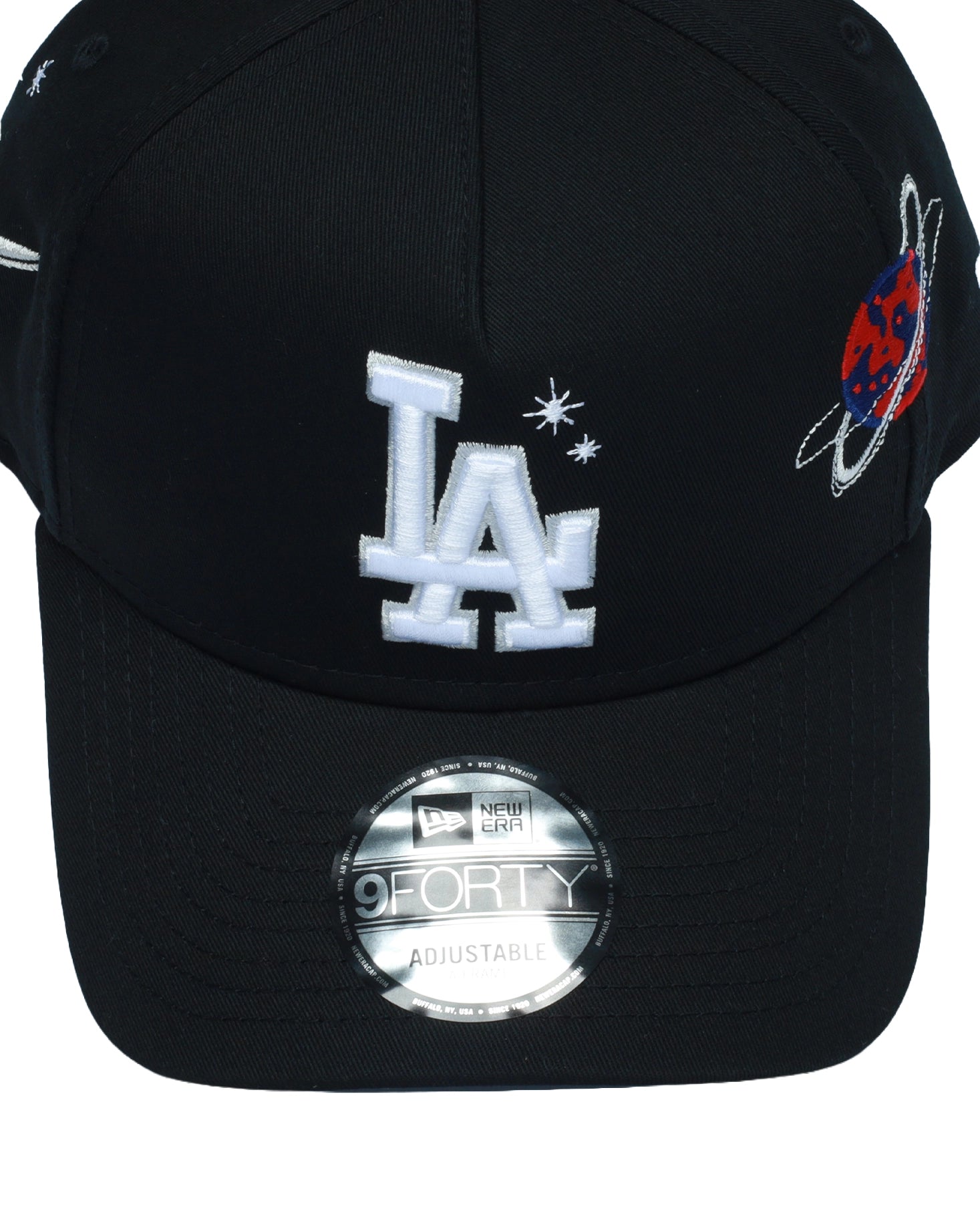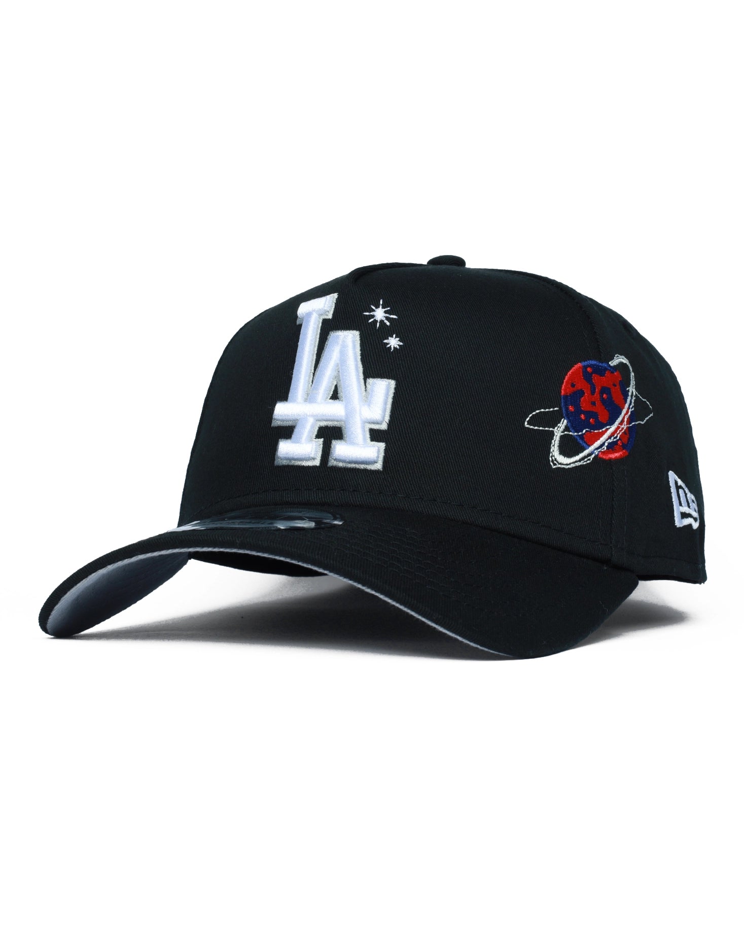 The New Era 9FORTY A-Frame Los Angeles Dodgers cap brings a standout twist to a classic shape with embroidered planet details for added personality. Crafted from 100% lightweight cotton, it's made for easy, all-day wear. The A-Frame design gives it a slightly more structured look, while the adjustable snapback closure keeps the fit flexible and comfortable. An easy finishing touch for laid-back outfits, it works effortlessly with tees, denim and everyday streetwear. Product Features 100% Cotton Curved brim finish A-frame silhouette Adjustable snapback closure Classic Los Angeles Dodgers logo embroidery Embroidery details.