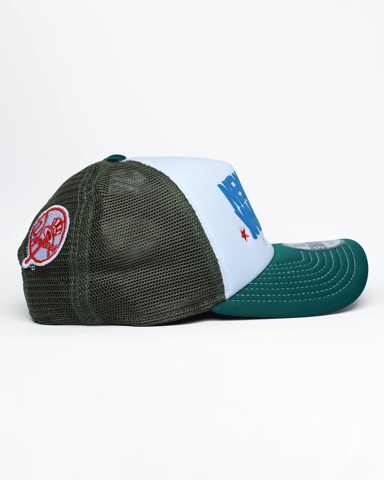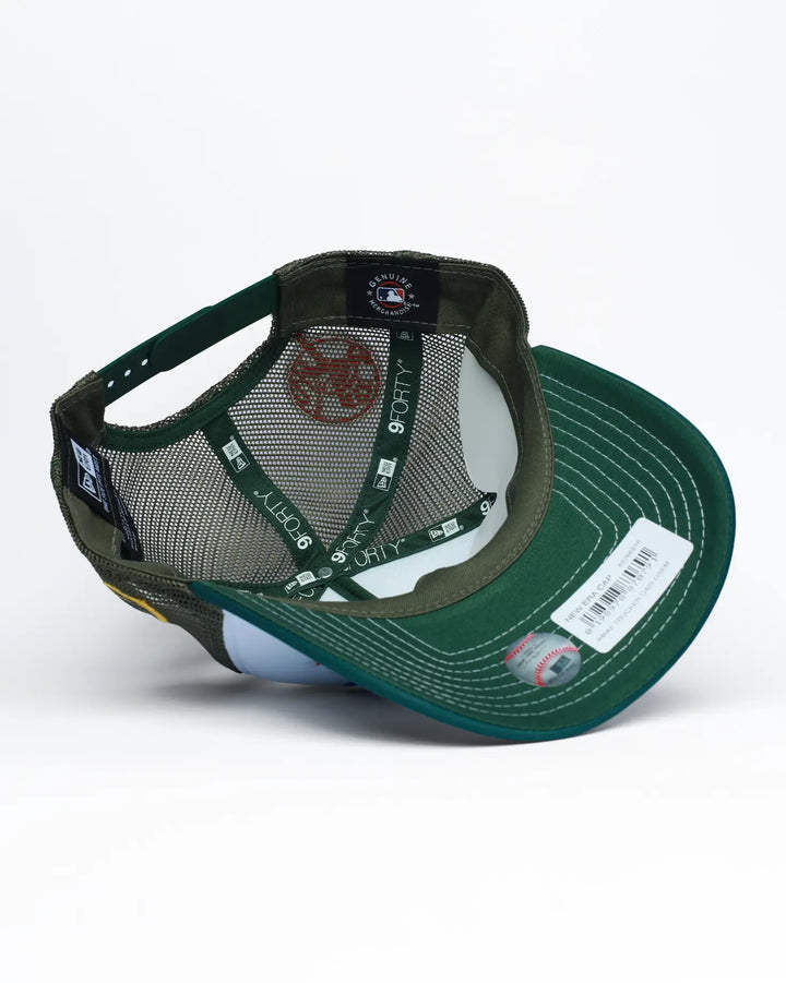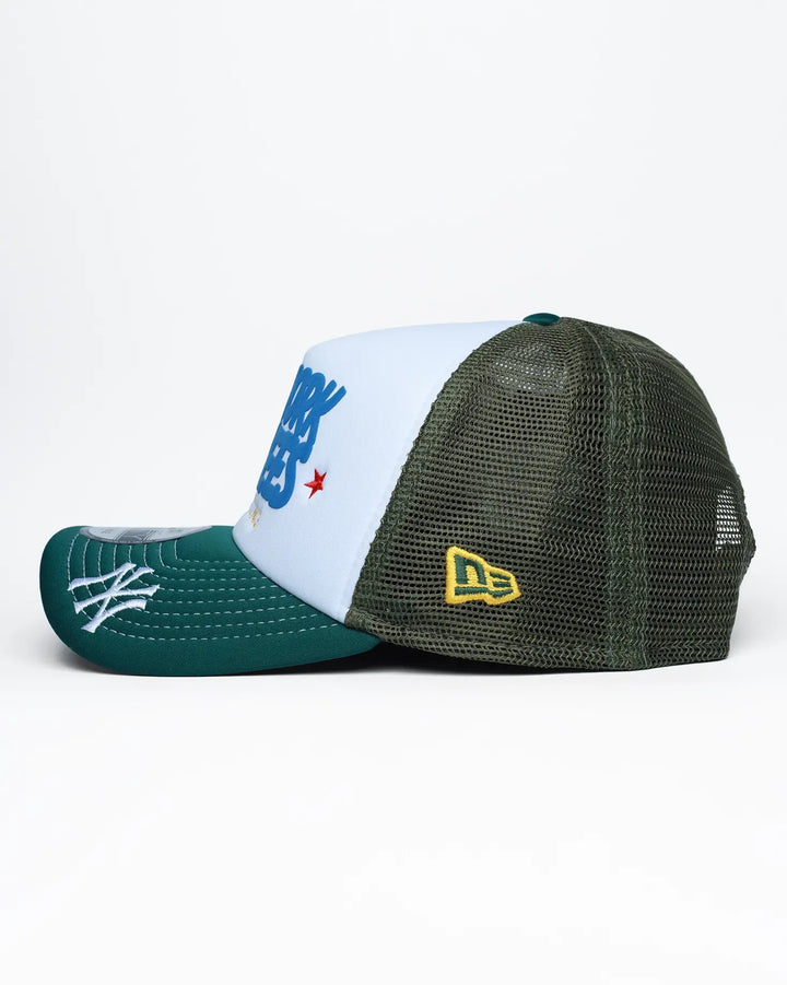 New York Yankees 9Forty A-Frame Trucker featuring a bold puff print design across the crown paired with New Era embroidery on both the crown and peak. The mesh back panel ensures breathability for all-day wear, while the embroidered New Era flag on the left side and embroidered eyelets add authentic detailing. Adjustable snapback fastening provides a customizable fit, complemented by the Yankees patch on the back and contrast stitching throughout for enhanced durability and visual appeal.