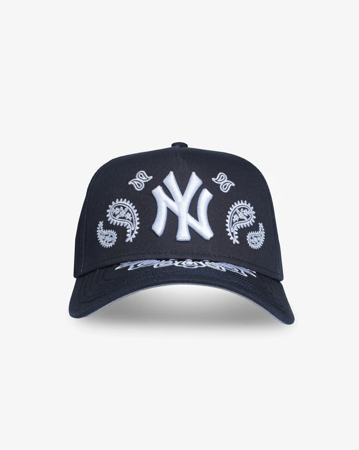 The New Era 9Forty A-Frame MLB Paisley New York Yankees cap combines traditional team spirit with refined style. Its structured 5-panel silhouette and high profile pinched crown provide a sharp, defined shape, while the navy base showcases intricate paisley patterns for a distinctive look. An adjustable snapback closure guarantees a tailored fit, complemented by a pre-curved visor for sun protection. Embroidered with the official Yankees logo, this cap offers authentic fandom with a sophisticated edge, ideal for those who value both performance and design.