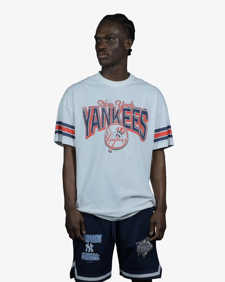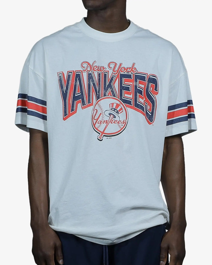 Celebrate timeless style with the New York Yankees Vintage Strip Arch T-Shirt by Majestic. Crafted with an oversized ...