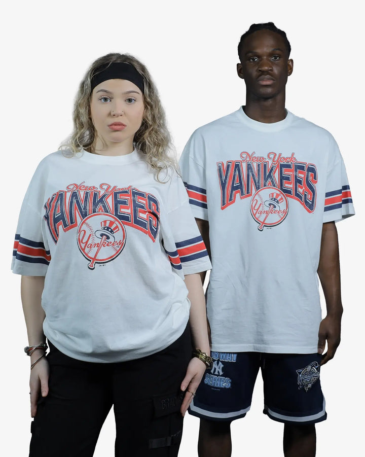 Celebrate timeless style with the New York Yankees Vintage Strip Arch T-Shirt by Majestic. Crafted with an oversized fit, this t-shirt prioritizes comfort while delivering a relaxed, authentic look perfect for dedicated fans. Its vintage inspired design pays homage to Yankees heritage, making it an essential addition to any sportswear collection.